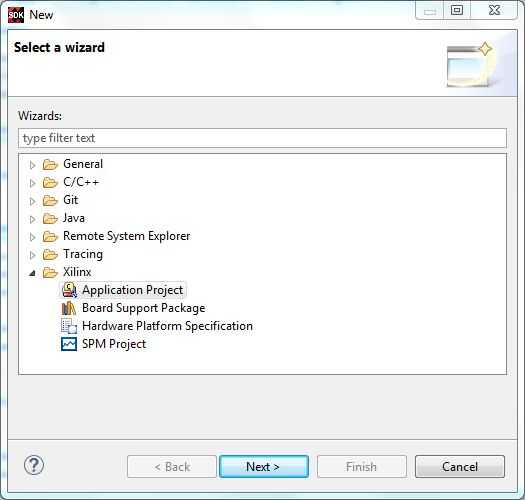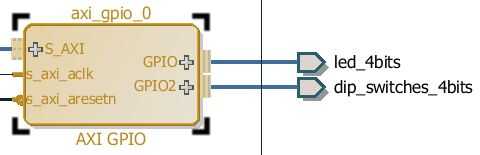 Una vez abierto el SDK de crear un nuevo proyecto de aplicación Xilinx con el nombre de su elección. Esto generará dos carpetas de proyecto en el panel Explorador de proyectos. Ampliar el azul uno y haga clic en la carpeta src. Seleccione nuevo -> archivo de código fuente. En el cuadro de diálogo llamar el archivo main.c. Copiar el contenido del archivo main.c a continuación en el nuevo archivo. Mirar el diseño de bloque, si el bloque de AXI GPIO parece la encima entonces no es necesario editar el programa. De lo contrario cambiar las líneas #define para que LED_CHANNEL 2 y SW_CHANNEL 1.