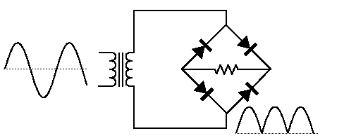 Cuando se utiliza en su uso más común, para la conversión de una entrada de corriente alterna (CA) en una salida de corriente directa (DC), se conoce como un puente rectificador. Un puente rectificador proporciona rectificación de onda completa de una entrada de corriente alterna de dos hilos. La salida de la tensión de alimenta el puente rectificador de diodos IC que proporciona una rectificado de onda completa que se alimenta en el circuito de rectificador de pico.