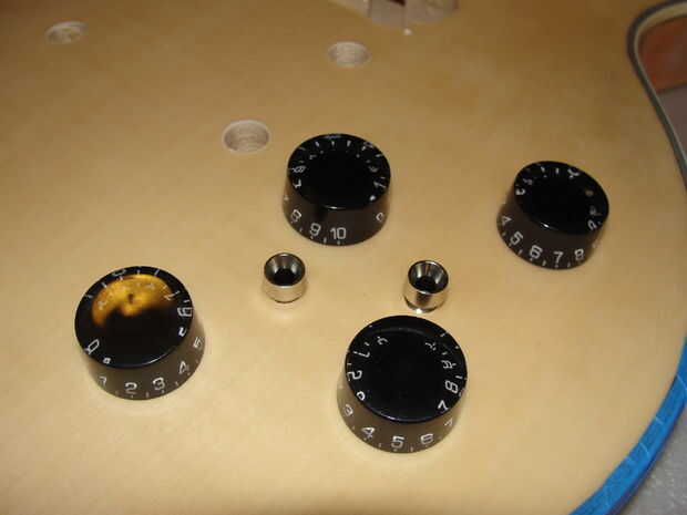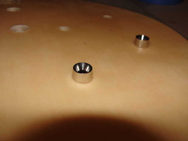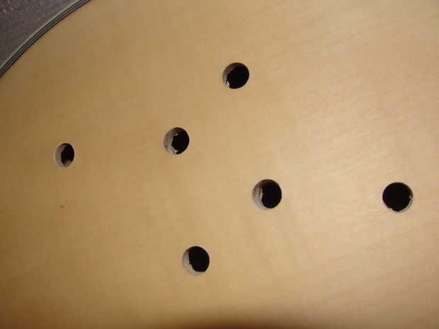 Ahora es el momento para perforar. Asegúrese de que usted tiene el tamaño correcto de broca. Es mejor ser a pequeño y conseguir más grande, porque una vez que se perfora la madera, no hay marcha atrás. Que alguien mantenga el cuerpo en una plana superficie acolchada para evitar que la guitarra mover. Mi papá sostuvo mina para mí. Asegúrese de que usted mira el nivel de burbuja en la parte superior de su taladro y mantenerlo lo más vertical posible, a menos que usted tiene un taladro disponible (yo no).
