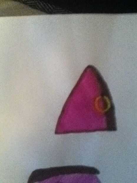 Dibujar un triángulo con puntas redondeadas y luego realizar 3d dibujando otro triángulo detrás de la primera one.draw un anillo de color amarillo en su oído para su pendiente.