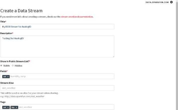 Usted tendrá que completar algunos detalles sobre su nueva línea de: un título, una descripción y algunos campos de datos. Lo que usted llama los campos de datos es importante: Asegúrese de que crear un campo llamado "rssi". El código eléctrico imp está configurado para enviar los datos de rssi con este nombre de campo, y si los campos no coinciden, el código generará errores. Usted puede crear otros campos si lo desea, también, pero el único que se que necesita (y el único el código ya está configurado para utilizar) son "rssi". Una vez que has llenado en los detalles y haga clic en "guardar", usted ser llevado a una página con las teclas a su corriente de nuevo. Guardar las claves públicas y privadas de esta página. Usted necesitará añadir estas teclas a su código de agente de electric imp para decir a su Imp eléctrico que flujo de datos de Sparkfun para registrar los datos.