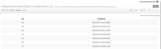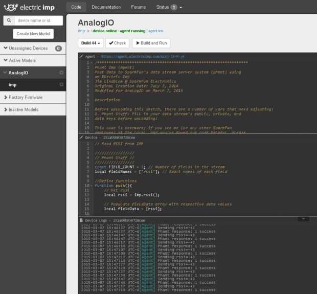 O puede utilizar el código que ya está escrito para usted. Cabeza a githuby aviso que hay dos archivos-uno para el agente y otro para el dispositivo. Por consiguiente, hay dos ventanas para el IDE - se dirá "agente" y el otro "dispositivo". Copie el código correcto en cada ventana. Si usted haga clic en "Crear y ejecutar", a ver el dispositivo lee el valor de rssi y luego ir a dormir, si todo funciona correctamente debería poder entrar en su corriente de la data.sparkfun.com través de su URL pública y ver los valores RSSI que! Si quieres ver mi corriente arriba y corriente, échale un vistazo aquí.
