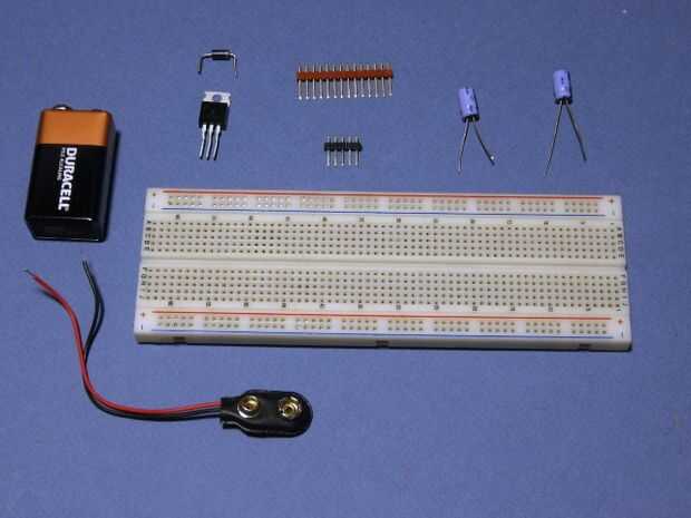 La batería de 9 voltios clip usos trenzado cables... que no conecte a un protoboard muy bien así que tenemos que hacer que podemos instalar las conexiones correctamente. Vamos a utilizar lo que se llama una cabecera SIP. (Pins en línea única) Los cables se sueldan a los pernos y luego se pueden insertar en el protoboard.