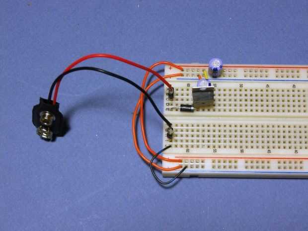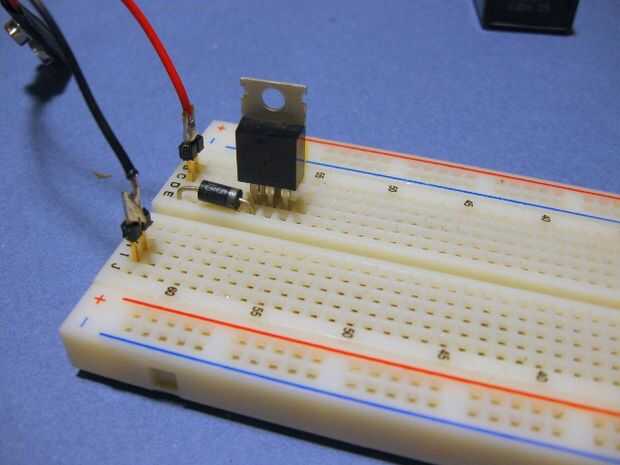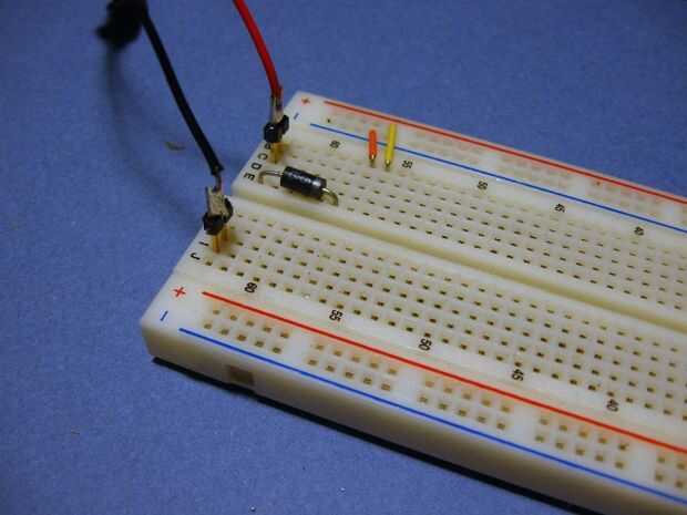 También queremos instalar un diodo en el circuito... permitirá actual para fluir en solamente una dirección. La razón por la que instalamos es de modo que si conectamos la batería hacia atrás no permitirá el flujo de corriente y protegerá a nuestro circuito de daño. El diodo tiene una línea impresa, esto debe ser en el lado más negativo, en nuestro caso... conecta a la entrada del regulador de voltaje.
