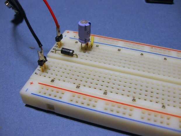 En la imagen #5 se puede ver que hemos añadido un condensador... es un 47uF clasificado por lo menos 6 voltios... son 25 voltios... así que son finas. Actúan para suavizar la tensión al encender y apagar cosas como LEDs. Una forma de pensar de ellos es como el depósito de agua en el inodoro... cuando usted descarga necesita un gran caudal de agua a la vez... pero la tubería es muy pequeña. El tanque contiene agua suficiente para compensar el flujo. Además, el condensador tiene energía extra para cuando hay un aumento de las cosas de arranque y parada.