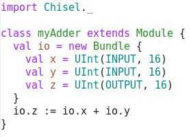 Programar una FPGA es diferente a otros estilos de programación. En lugar de dar las instrucciones a ejecutar en orden, se describe el diseño del hardware. Describir en un solo bloque sería muy desordenado y difícil de leer sin embargo. En cambio, similar a las funciones en otros idiomas el hardware se divide en módulos. Estos módulos están conectados juntos para hacer diseños más complicados. Cada uno de estos módulos de entrada y de salida. Al conectar estos módulos juntos similar a llamar a las funciones podemos crear complicados diseños legibles. La imagen muestra un ejemplo de un módulo en cincel que suma dos números. La línea superior de las importaciones cincel. Usted necesitará hacer esto en todos los archivos de cincel. A continuación declaramos un módulo de serpiente llamado myAdder. Este agregado tiene dos entradas x e y para calcular el resultado z = x + y. UInt es abreviatura de 'entero sin signo' declarado como entrada o salida con 16 bits. Cuenta cómo es ": =" no "=". Esto es muy importante pero será explicado más adelante. El siguiente paso será demostrar cómo conectar módulos en cincel.