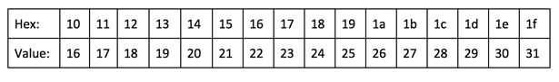 Hexagonal, como matemáticas normal, sólo cuenta para arriba, redondeo a 1 seguido por 0; así que 10 significa 16, 11 significa 17, y así sucesivamente, como cuenta normal, pero con más dígitos.