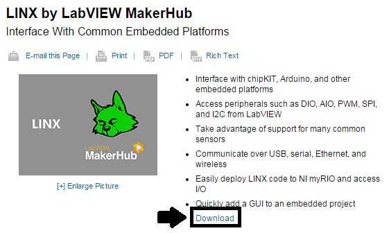 Si tienes problemas, una video las instrucciones de instalación detalladas pueden encontrarse en la Página principal de LINX de LabVIEW MakerHub haciendo clic en "Inicio".