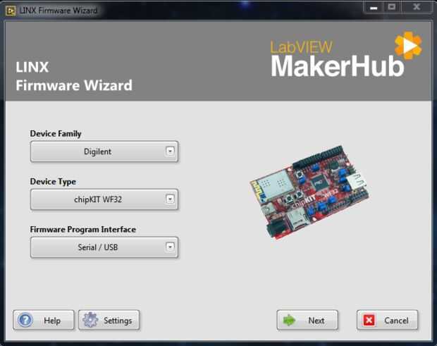 Con los drivers instalados, haga clic derecho sobre el puerto COM para el chipKIT WF32 y haga clic en propiedades y luego haga clic en configuración de puerto y elija avanzadas. En las opciones de BM, cambiar el temporizador de latencia a la 1 Sra. ahora, lanzar LabVIEW y haga clic en herramientas--> MakerHub--> LINX--> LINX Firmware Asistente para instalar el firmware LINX para el chipKIT. Elegir Digilent familia de dispositivos y seleccione chipKIT WF32 del tipo de dispositivo y haga clic en siguiente (en la fotografía superior). Elija el puerto COM que está conectado el WF32. Haga clic en siguiente y luego elegir LINX serial/USB y haga clic en siguiente otra vez. El firmware se transfieren a la WF32 y parpadearán las luces de a bordo. Otra vez, si usted está teniendo problemas con estos pasos, revisa la guía en LabVIEW MakerHub para instrucciones paso a paso videos.