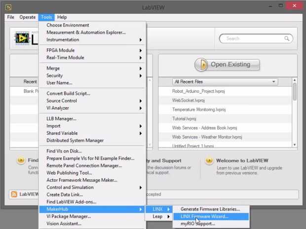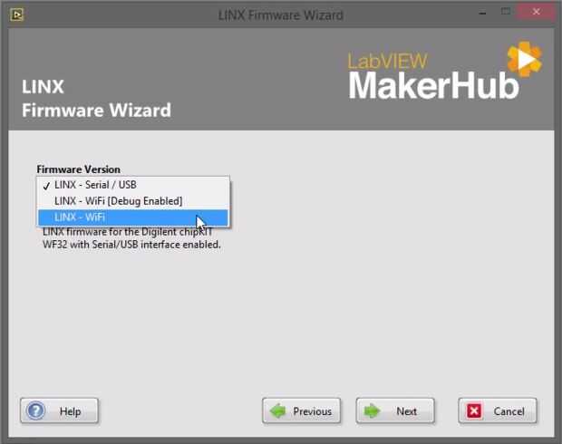 Para configurar Wi-Fi en el WF32, necesitará instalar el firmware WiFi. Abrir LabVIEW y en herramientas, haga clic en MakerHub--> LINX--> Asistente de Firmware LINX. Se abrirá al asistente de firmware. Elegir Digilent, chipKIT WF32 y serie/USB. Haga clic en siguiente. Ahora elegir el puerto COM que está conectado el WF32. Haga clic en siguiente. Ahora en la versión de firmware, elija LINX - WiFi.