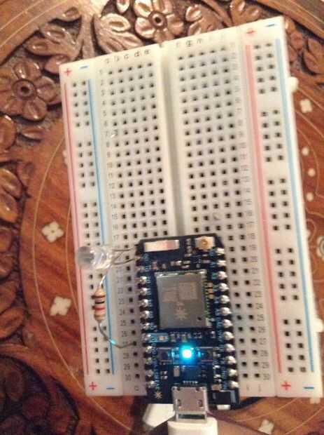 Para empezar a tomar el fotón y lo puso en el protoboard. Tome el pin positivo del LED y conectar al pin GPIO que desee. Luego tomar la resistencia y conecte la pata negativa a tierra. (Yo usé D0)