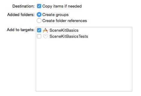 . Coloque en su proyecto GameViewController.swift. La pantalla de importación debe parecerse a la imagen de arriba. Ahora puede añadir una textura en una sola línea de código! Esta línea pasará entre estos dos: