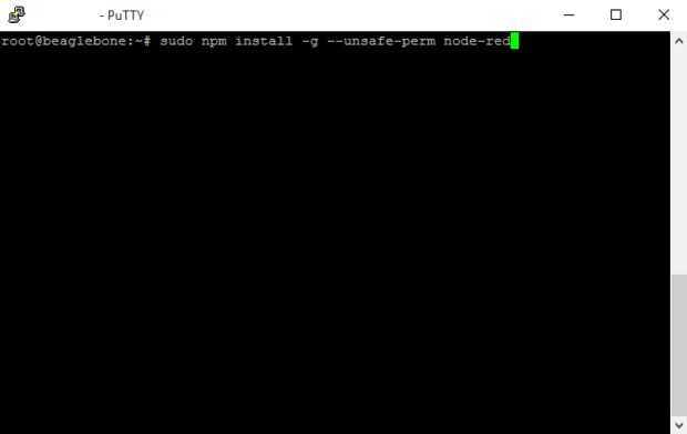 En primer lugar, asegúrese de que el BBB tiene una conexión a internet y SSH en. También querrás estar en la versión más reciente de Debian para la BBB para asegurarse de que tienes la última versión de Node.js (v0.10.x) que debe ser instalado por defecto en el BBB. Node.js es qué nodo rojo se basa apagado de. Si necesita actualizar Node.js, siga las instrucciones en esta página bajo el título "2014-05-14 GPG error: enable opcional". Si necesita instrucciones más detalladas, consulte la documentación de red de nodo.