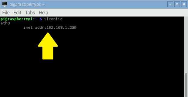 A continuación tenemos que averiguar qué dirección IP fue asignada a la RPI. Conecte su RPI al monitor mediante cable HDMI y un ratón y un teclado. A continuación, arranque el IPC. Se iniciará en modo de escritorio. Una vez que se carga el escritorio, abrimos una terminal y escribe "ifconfig" sin las comillas (fotografiado arriba). Esto mostrará un montón de información pero todo lo que necesitas encontrar es inet addr: cual es la dirección IP asignada a la RPI.