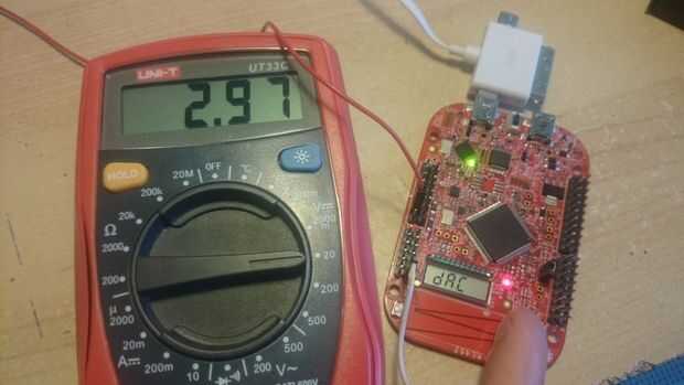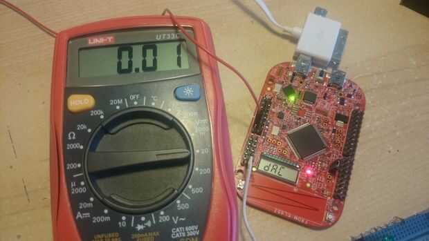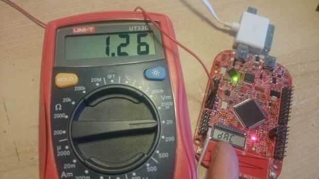 Como lo fue en ADC, aquí en CAD, también tenemos que crear el objeto pero en este caso sería AnalogOut name(DAC_PIN). He utilizado PTE30 como DAC0. Decidí integrar el regulador táctil con él (cómo comenzar con touch slider en que demostró). El multímetro muestra valor de PTE30 según donde pongo mi dedo en el touch slider. Con DAC también podemos generar la onda de seno o diente de sierra mediante las tablas con los valores apropiados. Para establecer el valor de la DAC salida que tenemos que utilizar name.write(value). Se llama a la función dac_programme() de la misma manera como ADC - en bucle infinito. El modo de funcionamiento de DAC señala el parpadeo del LED rojo.