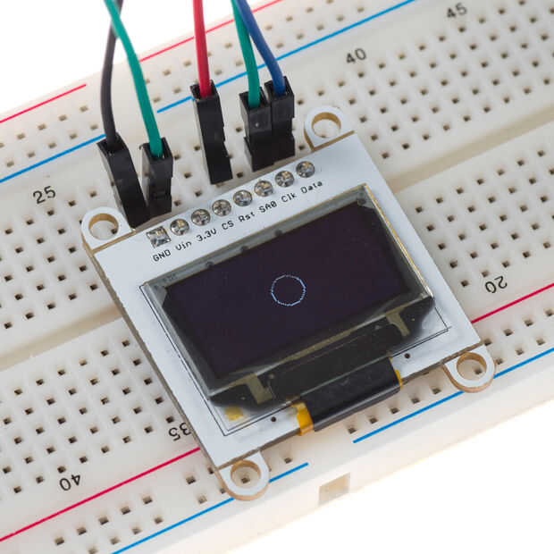 #include //Include Wire library for I2C communication#define HEIGHT 64 #define WIDTH 128 const int RST = 10; //Assign pin 10 for Reset int i; //Set variable i as integer static unsigned char array[1024]; //Buffer array void setup() { pin_init(); //Initialize pins initialize_OLED(); //Initialize screen memset(array, 0, sizeof(array)); //Initialize array with 0s circle(63,31,10); //Draw circle, (x,y,R) Flush(); //Send data } void loop() { } void pin_init(){ Serial.begin(9600); //Set baud for serial transmission pinMode(RST, OUTPUT); //Set RST as output } void initialize_OLED(){ Wire.begin(); //Initialize I2C interface digitalWrite(RST, LOW); //Set RST pin low delay(100); //Wait 100 ms digitalWrite(RST, HIGH); //Set RST pin high Wire.beginTransmission(0x3D); // Start communication with slave Wire.write(0x00); //Command stream Wire.write(0xAE); //Set display Off Wire.write(0xD5); //Set display clock divide ratio/oscillator frequency Wire.write(0x80); Wire.write(0xA8); //Set multiplex ratio Wire.write(0x3F); Wire.write(0xD3); //Set display offset Wire.write(0x00); Wire.write(0x40); //Set display start line Wire.write(0x8D); //Set charge pump Wire.write(0x14); //VCC generated by internal DC/DC circuit Wire.write(0xA1); //Set segment re-map Wire.write(0xC0); //Set COM output scan direction Wire.write(0xDA); //Set COM pins hardware configuration Wire.write(0x12); Wire.write(0x81); //Set contrast control Wire.write(0xCF); Wire.write(0xD9); //Set pre-changed period Wire.write(0xF1); Wire.write(0xDB); //Set VCOMH Deselected level Wire.write(0x40); Wire.write(0xA4); //Set entire display on/off Wire.write(0xA6); //Set normal/inverse display Wire.write(0x20); //Set memory address mode Wire.write(0x00); //Horizontal Wire.write(0xAF); //Set display on Wire.endTransmission(); //End communication with slave } /*Midpoint circle algorithm*/ void circle(int x0, int y0, int R){ int x = R; //Set x equal to radius int y = 0; int de = 1-x; while(x>=y){ draw_pixel(x+x0, y+y0); //First octant draw_pixel(y+x0, x+y0); //Second octant draw_pixel(-y+x0, x+y0); //Third octant draw_pixel(-x+x0, y+y0); //Fourth octant draw_pixel(-x+x0, -y+y0); //Fifth octant draw_pixel(-y+x0, -x+y0); //Sixth octant draw_pixel(y+x0, -x+y0); //Seventh octant draw_pixel(x+x0, -y+y0); //Eight octant y++; if(de<=0){ de += 2*y+1; } else{ x--; de += 2*(y-x)+1; } } } void draw_pixel(int x, int y){ if((x<0) || (x>=WIDTH) || (y<0) || (y>=HEIGHT)){ //Check for boundaries return; } else{ array[x+(y/8)*WIDTH] |= _BV((y%8)); //Store pixel in array } } void Flush(){ Wire.beginTransmission(0x3D); //Start communication with slave Wire.write(0x00); //Command stream Wire.write(0x00); //Set lower column start address for page addressing mode Wire.write(0x10); //Set higher column start address for page addressing mode Wire.write(0x40); //Set display start line Wire.endTransmission(); //End communication with slave unsigned char twbrbackup = TWBR; //Two wire bit rate register TWBR = 12; //Set to 400kHz for(unsigned short q=0; q<(WIDTH*HEIGHT/8); q++){ Wire.beginTransmission(0x3D); //Start communication with slave Wire.write(0x40); //Data stream for(unsigned char w=0; w<16; w++){ Wire.write(array[q]); //Transmit data to be displayed q++; } q--; Wire.endTransmission(); //End communication with slave } TWBR = twbrbackup; } La función del círculo se basa en el Algoritmo de punto medio círculo para generar círculos con los pixeles. El algoritmo dibuja un píxel a la vez en cada octante del círculo por medio de simetría hasta completa la circunferencia. Una vez más, la función del pixel se utiliza para dibujar cada píxel del círculo cada vez se le llama en el programa. Consulte el siguiente enlace para más información sobre el algoritmo: