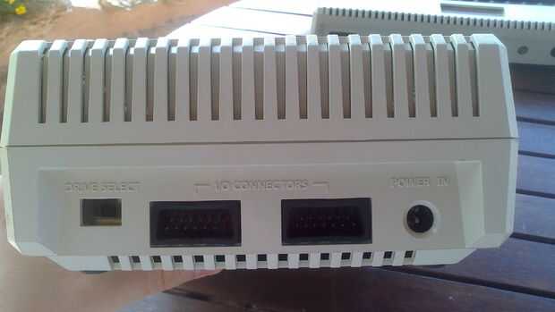 En la parte trasera, tenemos, de izquierda a derecha, los interruptores de selección drive (usados para conectar más de una unidad a la computadora), los conectores de dos cuentos por entregas y el poder de jack. En la parte delantera, sólo la unidad de disquete y una potencia interruptor de botón y dos leds.