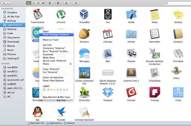 Para usuarios de Mac Lion, la carpeta de Arduino puede no poner bajo documento/Arduino, abra su carpeta de aplicación, encontrar "Arduino", click derecho y "Mostrar contenido del paquete".