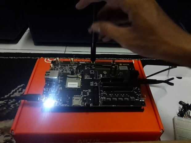-Conectar la placa al ordenador mediante el cable USB. Hay solamente un conector micro-USB en el tablero. Debería ver la Rx y Tx LEDs iluminan.