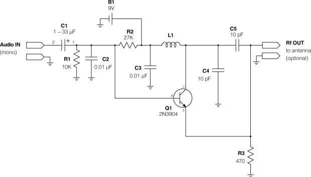 Circuitos montados en tablero de pref no son necesariamente frágiles pero pueden ser menos resistente a los choques de placas de circuito impreso. Aquí es un diagrama esquemático del transmisor FM. Coloque los componentes correctamente como se muestra en el esquema. (10 uf) el condensador tiene polaridad así que tenga en cuenta los terminales de la negativa del condensador es para audio pin y lo positivo se une a la resistencia. Puede enfrentar algunos problemas mientras lo hace a bordo de pref. En primer lugar Coloque todos los componentes con algo de espacio entre ellos. Si usted es un principiante el espacio entre los componentes debe ser más. Evitaría el riesgo de circuito de disparo. Colocando el transistor tenga en cuenta el pasador fuera del transistor 2N3904. Coloque todos los componentes y soldarlos cuidadosamente y cortar los pernos adicionales utilizando una pinza.