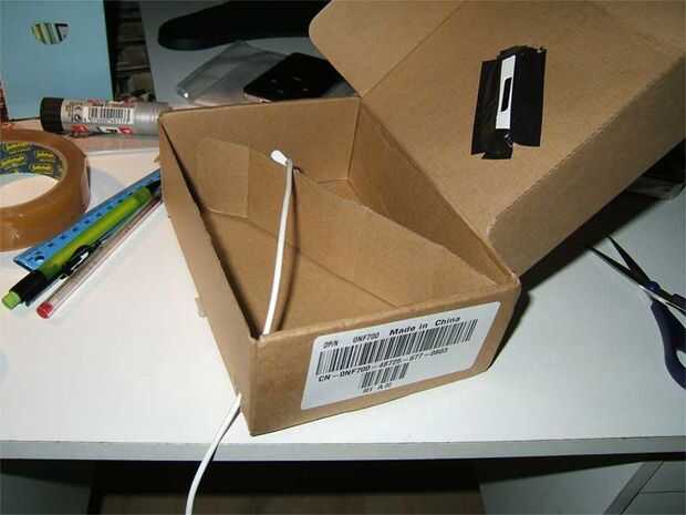 Con el cuchillo otra vez, corte un agujero en el lado de la caja (preferiblemente la parte trasera de la caja mirando hacia fuera). Esto es para que el cable salir de la caja. Alimente el cable a través del orificio.