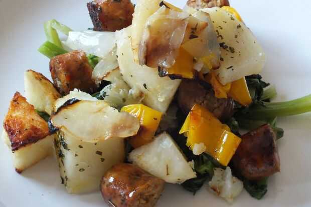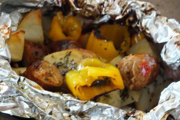 1. las patatas blancas fueron cocidas dentro de un paquete de papel de aluminio pero el paquete pequeño hace las verduras parezca oscuro, pequeño y bien empaquetado. Cuando dado espacio, ontop de brillante verdes verduras la patata blanca simple parece atractiva y el ají amarillo se convierte en el estallido de color y no el color principal como en la foto 2. El plato blanco en realidad aclara la papa cocida y muestra su atractivo tostado.
