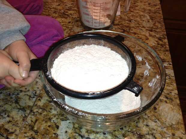 Entonces en uno de los tazones de fuente de tamaño mediano, tamizar la harina en el tazón de fuente en incrementos de. Agitar lentamente hasta que tenga todo su tamizada en la taza. Luego Vierta el bicarbonato de sodio, la sal y el azúcar en su tazón de fuente.