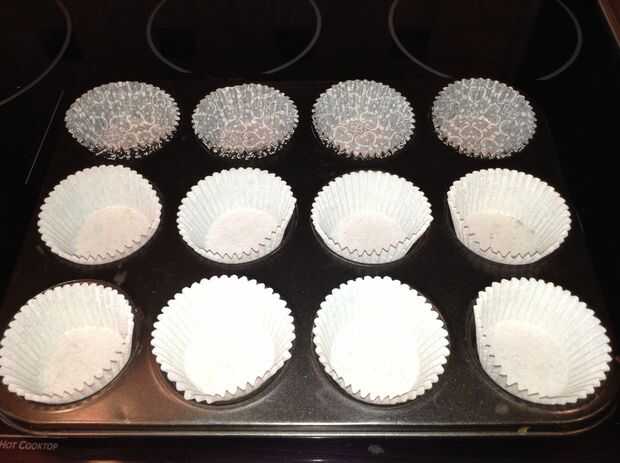 * Para ahorrar tiempo, precalentar el horno a 350 grados y forrar su bandeja de Magdalena con el papers.*