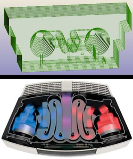 Después de una breve investigación en características de diseño que podrían mejorar la calidad de sonido, he encontrado que puede ayudar una ruta de sonido alargada. Para seguir este intentó replicar la tecnología de guía de onda de Bose creando tubos enrollados en el muelle de la parte trasera de los altavoces