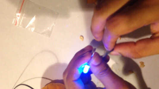 El LED de prueba, conecte el extremo largo del LED a la + final de ve de la batería (se debe ver un signo en un lado de la batería +) y el extremo más corto hasta el final - ve de la batería.