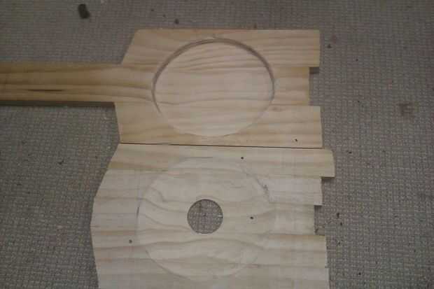 Entonces yo hice algo parecido con la parte inferior – emparejar mi madera como yo estuve cortando a la forma superior de una manera muy áspera y lista. Marcado el mismo círculo de la taza / cono/cámara resonante como la tapa armónica, aburre un agujero de 2 pulgadas en el centro usando un agujero vio y luego sacado con pala hacia fuera el resto en forma de tazón de fuente usando la amoladora / lijadora. Porque no creo que aquí se requiere precisión y es difícil conseguir curvas usando otros métodos, creo que la amoladora es realmente el mejor método a utilizar aquí. Entonces lija la parte superior e inferior un poco el aplanador que estaban, donde iban a unirse.