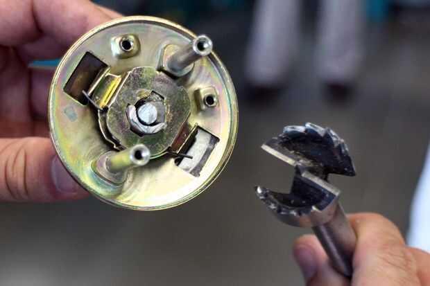 Para acomodar el mecanismo de rotación de la perilla de la puerta he seleccionado un gran diámetro pieza Forstner que era ligeramente más grande que el diámetro del mecanismo de rotación en la parte posterior de la perilla de la puerta.