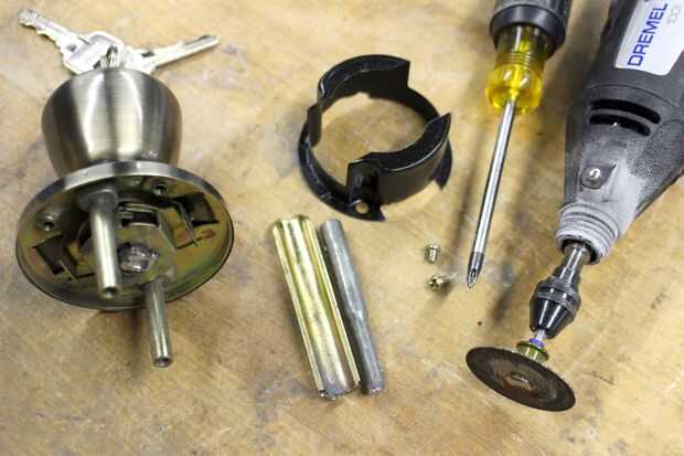 Aquí está una foto de la perilla de la puerta preparado; el anillo de plástico fue quitado, y el eje metálico central que conecta el mando correspondiente de la puerta ha sido cortado.
