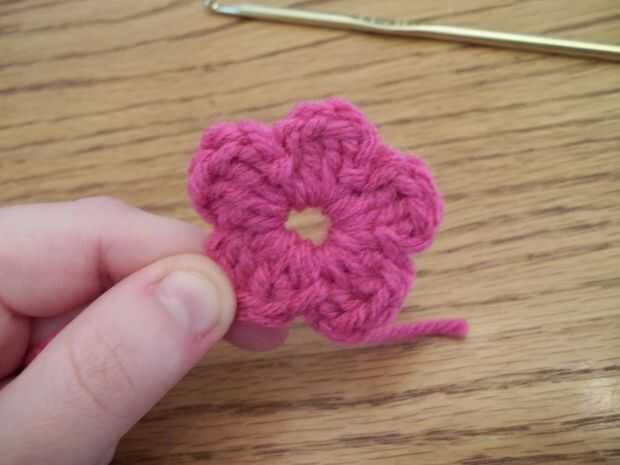 CH 4, participar en la 1ª cadena, * ch 2, 3 dc en el centro del círculo, sl st.* ** repetir 4 veces más. Vas a querer mover las puntadas más crunch juntos para dar cabida a todos los pétalos. Fije apagado. No en los extremos de la armadura o cortarlos.