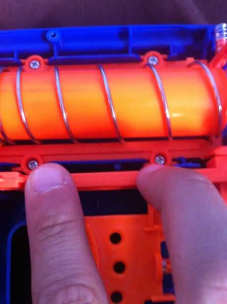 En la parte posterior de la pistola verá un soporte con cuatro tornillos, con la primavera en el centro, quitar la parte inferior dos y la primavera. Usted también necesitará quitar el retén con resorte en la parte superior en la parte posterior.