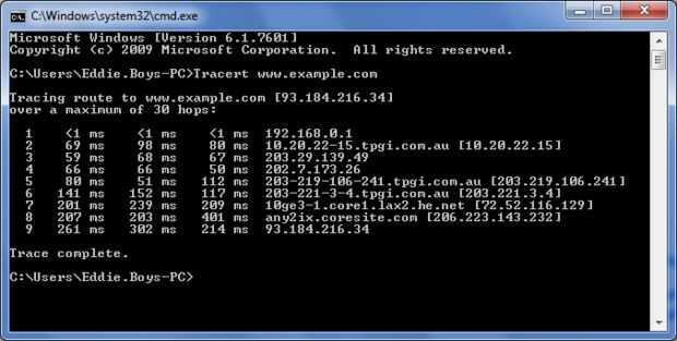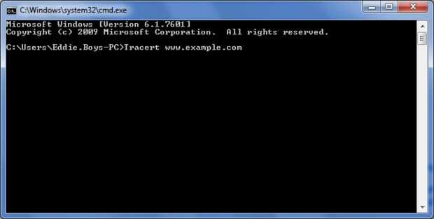 En primer lugar usted desea ir al menú Inicio y buscar "CMD" que debe venir para arriba con cmd.exe simplemente haga clic en él y el promt de comandos debe abrir. Tipo "Tracert www.example.com" escriba el dominio web que desea medir y no www.example.com " espere unos dos segundos y debe aparecer la IP.