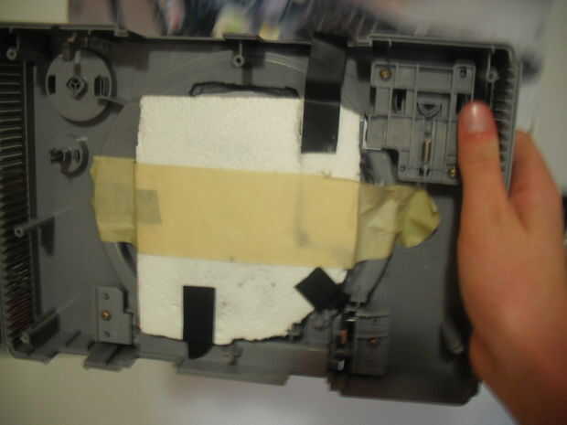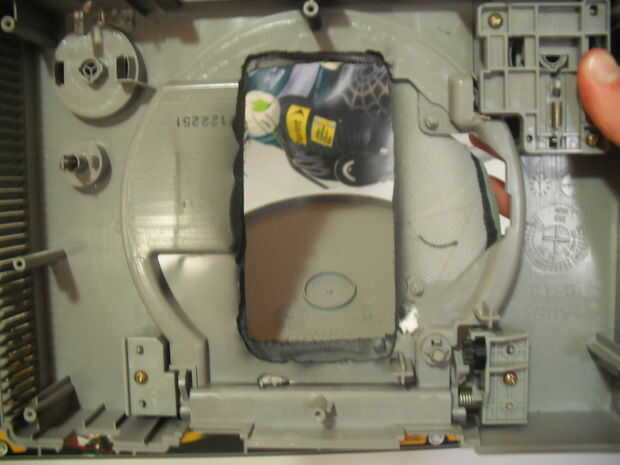 Cuando terminas de dremeling, usted puede estar pensando, "Qué hizo justo!". Cuando veas un agujero no en forma de un ipod, no te preocupes. Cortar un trozo de tela que se adapta a donde normalmente sería poner un disco del juego (deje un agujero para tu ipod por supuesto) y péguelo en una posición adecuada. (corte los orificios donde sea necesario tan tapa puede todavía funcionar) de cinta o pegamento en su lugar.