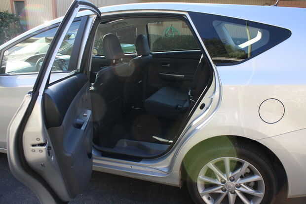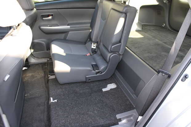 los asientos traseros en la diapositiva de Toyota Prius V 2012, reclinar, doble piso y, si estás dispuesto a tomar una toma en su coche, se quitan fácilmente. Sacar uno o dos puestos realmente aumenta el espacio de carga. Corté una de las tapas de plástico para que sea aún más fácil de quitar los asientos.
