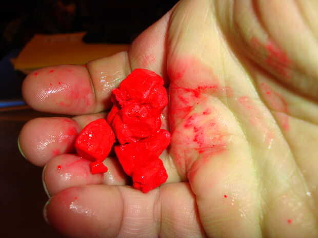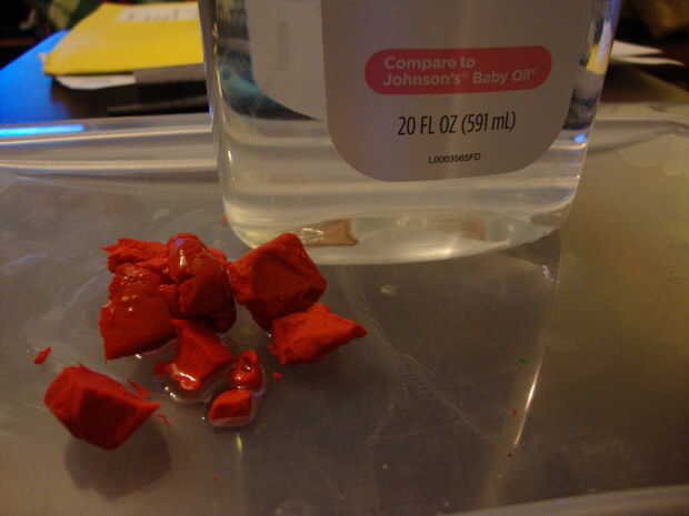 Mezclar el aceite con los dedos. Si no lleva guantes, las manos tendrán el color de la arcilla que está trabajando, todo ellos. No se preocupe se lave.