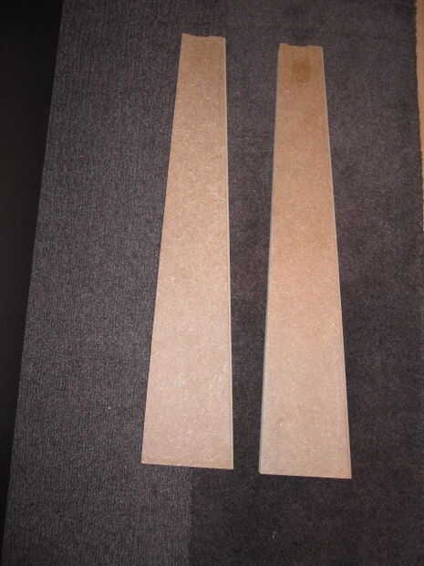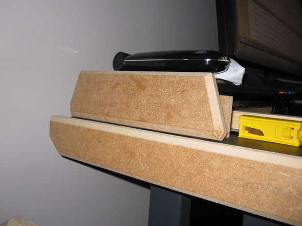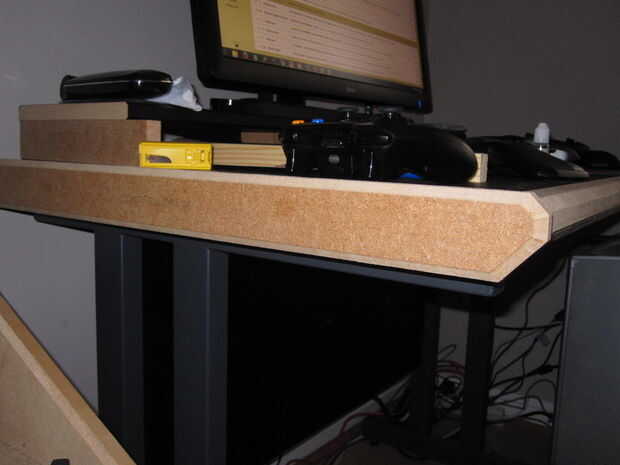 Piezas de forma de MDF fueron cortadas por los lados de la mesa y el estante del monitor. Un poco de chaflán fue usado en el router para crear los bordes biselados. Tiras de ángulo fueron cortadas para colocar en la parte posterior de las piernas. Trataba de ocultar ningún cable conectado a la parte posterior del tablero de la mesa vanidad.
