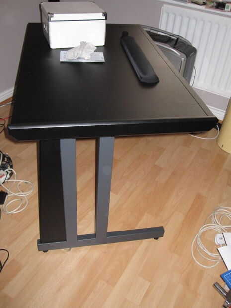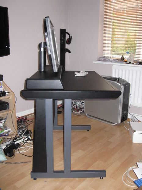 Las piezas de la parte superior fueron llenadas, preparado y pintado a spray. Las secciones inferiores fueron cubiertas con vinilo. Los lados para el estante del monitor se extienden ligeramente para asegurar que el estante es estable.