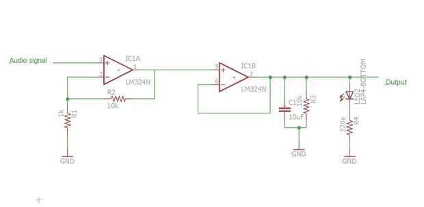 Para comprobar si es trabajo sólo tiene que añadir un LED con un limitador de corriente en la salida del seguidor de voltaje. Si tu circuito es correcto, el LED se encenderá según tu música.