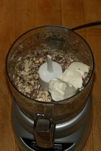 Agregar el queso crema y procesar hasta que todo se mezcla y batida, raspar hacia abajo los lados de vez en cuando con el fin de tener una mezcla uniforme.
