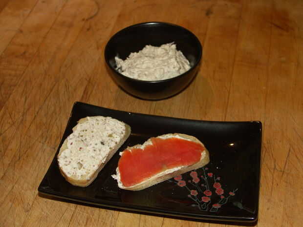 Servir con panes apropiados, pedazos de pan tostado, galletas, etc. y por supuesto el salmón ahumado. (aquí vemos que algunos ahumados salmón rojo en rebanadas de rodillo francés.)