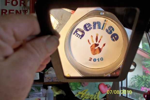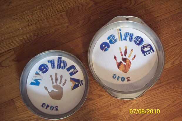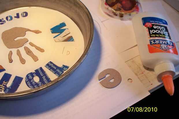 Aquí, un pedazo de papel es "viró" en el fondo de la tartera con spray adhesivo. No rocíe el papel entero, sólo en dos o tres puntos. Las letras y la huella de la mano entonces se arreglan como deseado. Me gusta un arreglo más formal, pero las letras pueden colocarse de forma aleatoria, no tan "limpia". Nota: letras se invierten cuando se encole en formulario de papel en. Para comprobar la alineación, utilice un espejo como se muestra a leer los nombres.