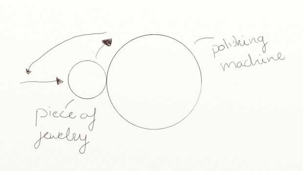 Cuando han puesto la máquina, puede comenzar a pulir. Trate de no querer terminar la cosa completa a la vez, apenas se centran en una sola pieza en el momento. Con cuidado llevar la pieza a la mitad de la pieza pulidora y moverse que contra la dirección de la máquina está girando. Yo también he dibujado una rápida explicación de esto, ver la foto de arriba.