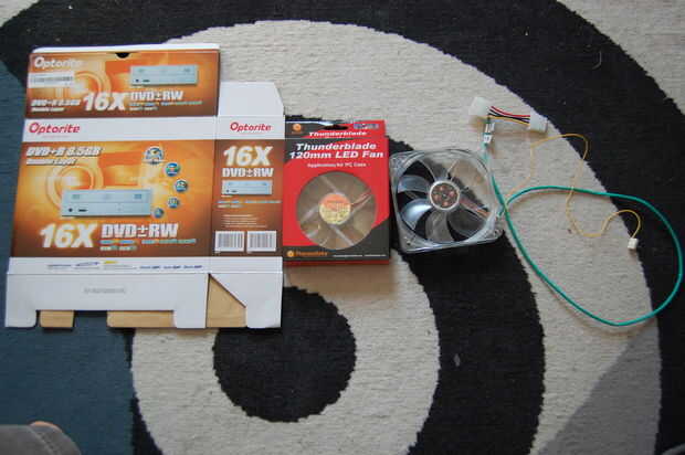 -Caja de cartón de algún tipo. Sólo lo suficientemente grande para adaptarse a los fans. Elegí una caja de accionamiento del quemador DVD Optorite que tenía por ahí.