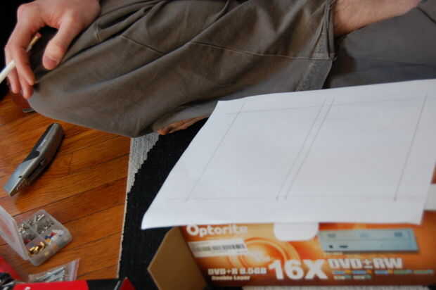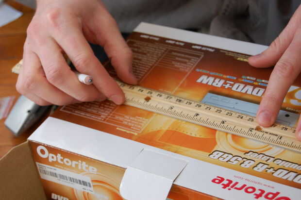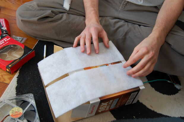Siguiente que tenía que decidir sobre cómo cortar los agujeros para el filtro de manera que habría suficiente aire pasando a través pero aún apoyo el filtro. Midió y cortó el filtro a la medida que resultó para ser de 6 x 4 pulgadas. Entonces medí en la caja 1/4 de pulgada en desde donde el filtro iba a ser había iniciado rectángulos corte saliendo de un bar en el centro por lo que no sería demasiado débil.