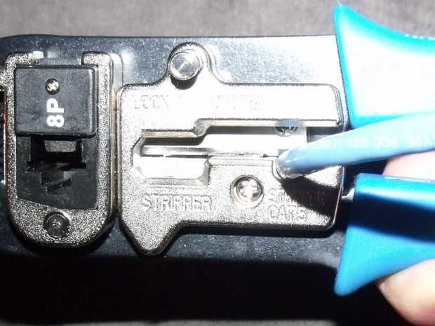Sus arrugadores allí es también un conjunto de cortadores de alambre y dos separadores de cable. Cortar aproximadamente 1/4-1/2 del extremo del cable CAT V para que tengan un corte uniforme de los alambres internos dentro de la caja de cable. En el caso de cable CAT V, vas a utilizar el lado de CAT V de los strippers. Se trata de un semicírculo con una cuchilla por encima de él. Pegar alrededor 1" del cable en el semicírculo de la stripper de la carcasa (1" debe ser en o después de la hoja). Esto es importante porque en el siguiente paso va a ser desentrañar todos los 4 pares del cable expuesto y necesitará una cantidad considerable del alambre subyacente que incluso con el interior del conector RJ-45.