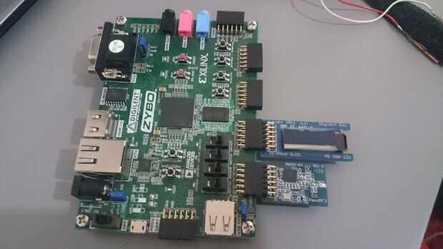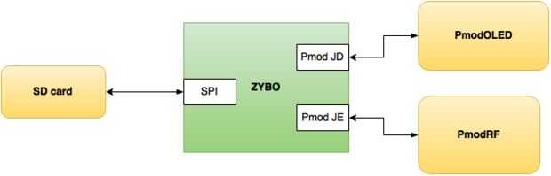 En primer lugar, conecte la pantalla OLED y el transceptor de radio a ZYBO como en los diagramas. También colocar una tarjeta de memoria en la ranura.